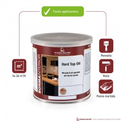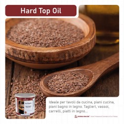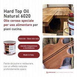 Based on natural oils and enriched with high quality resins and waxes, Hard Top Oil gives an excellent protection, with a pleasant natural effect. Suitable for kitchen tables and tops in general, as well as cutting boards and wooden utensils, it is certified for food contact according to EN 71.3, DIN53160 and DIN68861. Also available in the waxy version with natural matt effect Hard Top Oil Natural 6020 . Applicable with brush, rag, roller or spray. However, for a particularly natural effect, we recommend removing the excess with a soft cloth. Allow to dry completely before using the treated object. The chopping boards and in general the items of frequent use can be washed with water and neutral soap; they will be subject to maintenance proportional to the frequency of use. Indicative yield: 14-26m2 / Lt