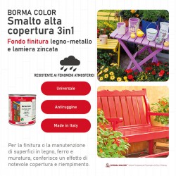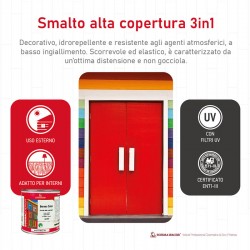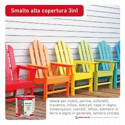 Smalto ad alta copertura pronto all'uso, di facile applicazione, adatto ad ogni tipo di supporto, in ambiente interno ed esterno. Lucido e opaco.