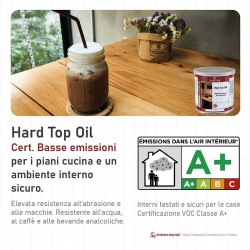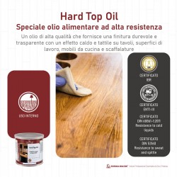 A base di oli naturali ed arricchito con resine e cere di alta qualità, Hard Top Oil conferisce un'ottima protezione, con un piacevole effetto naturale. Adatto per tavoli e piani da cucina in genere, come anche taglieri ed utensili in legno, è certificato per il contatto alimentare secondo le normative EN 71.3, DIN53160 e DIN68861.